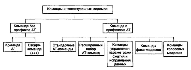 Все команды современных интеллектуальных модемов можно классифицировать, как это показано на рис. 4.2. Данная классификация не является окончательной и может расширяться в процессе роста функциональных возможностей модемов, например таких, как организация закрытых шифрованных каналов связи.