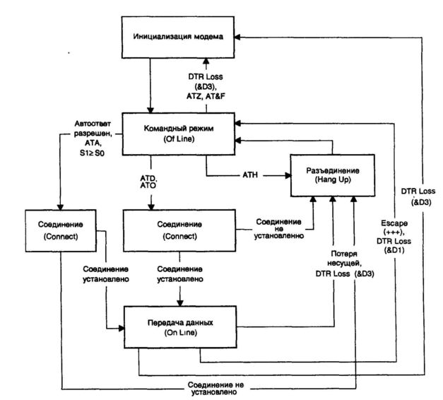 Возможные состояния интеллектуального модема и переходы между ними поясняются диаграммой, приведенной на рис. 4.1.