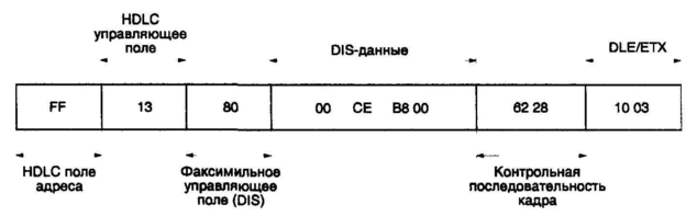 Следующий байт факсимильного управляющего поля 01 h (посылаемый к DTE как 80h) указывает, что поступил DIS-кадр. DIS-данные содержат, как минимум, 24 разряда (3 байта) флагов, которые сообщают возможности принимающего факс-терминала. Эта информация используется вызывающим факс-терминалом для определения оптимальных установок параметров сеанса связи.