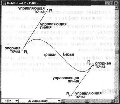 Общий вид элементарной кривой представлен на рис. 4-1. Такую кривую можно построить, если известны координаты четырех точек, называемых контрольными. Из четырех контрольных точек кривая проходит только через две, поэтому эти точки иначе называются опорными (иначе они называются узлами (node), поскольку «связывают» элементарные кривые друг с другом, чтобы образовать единый сложный контур). Две другие контрольные точки не лежат на кривой, но их расположение определяет кривизну кривой, поэтому эти точки иначе называются управляющими точками, а линии, соединяющие управляющую и опорную точки, — управляющей линией (в просторечии их именуют «рычагами»).