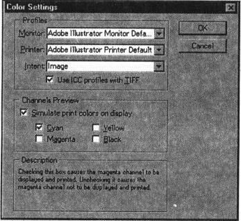 При установке флажка Simulate print colors on display (Имитировать печатные цвета на экране) в поле Channels Preview (Просмотр каналов) можно в какой-то степени увидеть на экране цветопередачу изображения, которое будет отпечатано на выбранном цветном устройстве. Этот режим чрезвычайно полезен возможностью просмотра печатного оттиска каждой полиграфической краски и их сочетаний до вывода на печать.