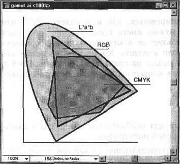 Рис. 4-12. Цветовой охват моделей L*a*b. RGB, CMYK