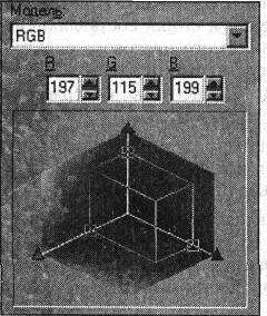 Эта модель представляется в виде трехмерной системы координат (рис. 4-7). Каждая координата отражает вклад соответствующей составляющей в конкретный цвет в диапазоне от нуля до максимального значения. В результате получается некий куб, внутри которого и «находятся» все цвета, образуя цветовое пространство.