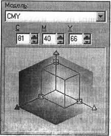 Рис. 4-8. Цветовая модель CMY представляется в виде трехмерного графика, у которого нулевая точка — белый цвет