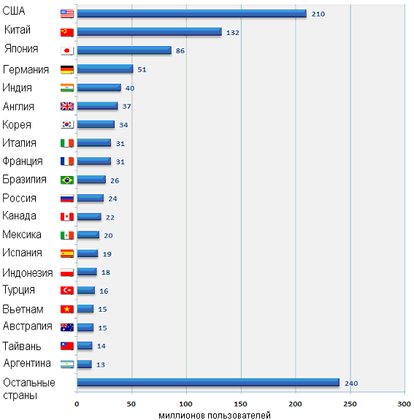 Зато у ComScore вышло, что среди пятнадцати стран с самым высоким уровнем проникновения Интернета аудитория Сети росла самыми высокими темпами в России (на 21% - с 10,471 млн. человек старше 15 лет в январе 2006), Индии (на 33% - с 15,867 млн. до 21,107 млн.) и в Китае (на 20% - с 72,408 млн. до 86,757 млн.). Китай по такой оценке представляет вторую Интернет-державу в мире по количеству аудитории после США. Однако Интернет-аудитория США почти вдвое больше китайской, хотя и выросла за год лишь на 2% - до 153,4 млн. пользователей.