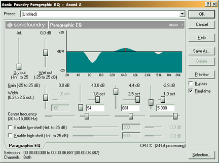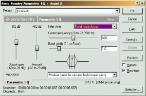 Для частотной обработки обычно применяется эквалайзер. Эквалайзер – это устройство или программное средство, позволяющее раздельно управлять громкостью частот в различных диапазонах сигнала. В Sound Forge эквалайзер представлен в трех вариантах: графический, параграфический и параметрический.