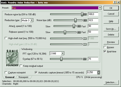 Перед вызовом Noise Reduction необходимо выделить фрагмент файла от 200 до 500 милисекунд, который должен быть тишиной (например, пауза между словами). Далее выполняется сканирование выделенного фрагмента (Capture noiseprint). Noise Reduction позволяет задавать глубину подавления шума, а также иные параметры. Предлагается несколько режимов обработки. Режим точного подавления Mode 0, режим «приблизительного» подавления Mode 3. При нажатии кнопки Selection задается область применения обработки (в противном случае шум будет удален из выделенного ранее фрагмента). В случае необходимости можно повторить выполнение Nose Reduction.