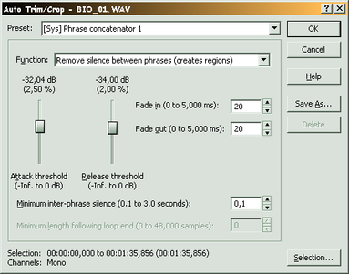 В этом окне можно задать минимальное расстояние между фразами (Minimum inter-phrase silence). Все участки тишины, короче заданного значения вырезаны не будут.
