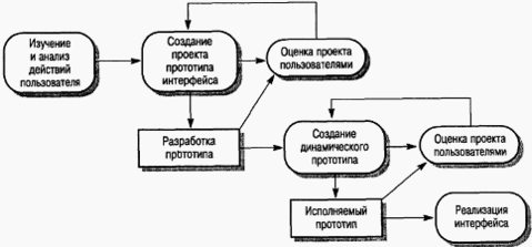 На мал. 15.1 зображений ітераційний процес проектування призначеного для користувача інтерфейсу. Найбільш ефективним підходом до проектування інтерфейсу користувача є розробка із застосуванням моделювання призначених для користувача функцій. На початку процесу створюються паперові макети інтерфейсу, потім розробляються екранні форми, що моделюють взаємодію з користувачем. Бажано, щоб кінцеві користувачі брали активну участь в процесі проектування інтерфейсу .