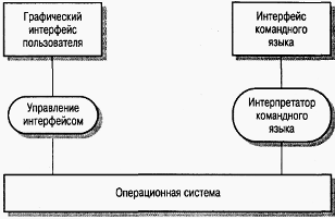 В принципі необхідно застосовувати різні стилі взаємодії для управління різними системними об'єктами. Даний принцип складає основу моделі Сихейма (Seeheim) призначених для користувача інтерфейсів .У цій моделі розділяються представлення інформації, управління діалоговими засобами і управління додатком. Насправді така модель є швидше ідеальною, чим практичною, проте майже завжди є можливість розділити інтерфейси для різних класів користувачів (наприклад, початкуючих і досвідчених). На мал. 15.2 зображена подібна модель з розділеними інтерфейсом командної мови і графічним інтерфейсом, лежача в основі деяких операційних систем, зокрема Linux.