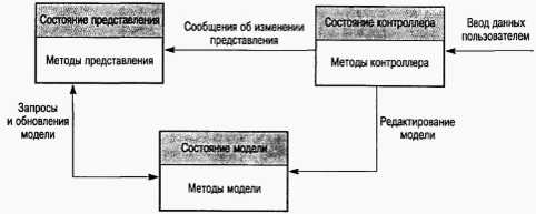 Підхід "модель-представление-контроллер" (МПК), представлений на мал..4, отримав первинне застосування в мові Smalltalk як ефективний спосіб підтримки різних представлень даних. Користувач може взаємодіяти з кожним типом уявлення. Дані, що відображаються, інкапсульовані в об'єкти моделі. Кожен об'єкт моделі може мати декілька окремих об'єктів уявлень, де кожне уявлення - це різні відображення моделі.
