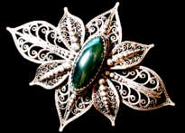 Филигрань или скань - один из древнейших видов художественной обработки металлов в России. Название "филигрань" происходит от латинских слов filum - нить и granum - зерно; "скань" - от древнеславянского - свить, скрутить. Названия указывают на особенность технологии - для изготовления филигранных изделий использовали скрученные проволочки и "зернь", т.е. маленькие шарики. Техника филиграни состоит в следующем: узор из тонкой медной проволоки накладывают на бумагу, приклеивая по нарисованному контуру, посыпают серебряным припоем и затем элементы узора соединяют при помощи пайки. Объемные формы выполняют также, но бумагу с нарисованным узором наклеивают на железную заготовку. В гальваническом цехе изделия покрывают серебром.
