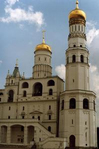 В 1600 г. по велению царя Бориса Годунова колокольня была надстроена и завершена позолоченным куполом, что было увековечено надписью золотыми буквами по синему фону у основания главы. К этому же времени относится и пояс килевидных кокошников у основания барабана купола, который соединил воедино восьмигранник третьего яруса и цилиндр барабана, подчеркнув устремленность колокольни вверх.