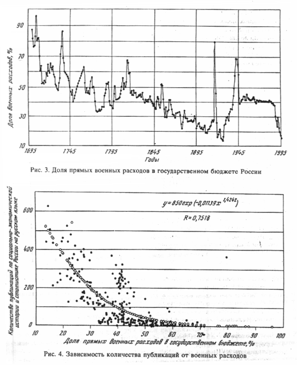 Наибольшие искажения за советское время касались реальных затрат экономики на оборону. Без их хотя бы приблизительного отслеживания невозможно представить реальную структуру экономики страны, соответственно, выявить связи ее с культурой. На рисунке 3 показана одна из версий реконструкции военных расходов: до середины 20-х годов XX века на основании отчетных данных, далее реконструированных с омощью методов имитационного моделирования. Так как эти расходы показаны в роцентной доле от расходного бюджета страны, по имеющим место тенденциям ожно косвенно судить о возможностях расходов по другим статьям бюджета и, в мтности, о потенциальной способности трат на образование и культуру. За сложным процессом динамики военных расходов в государственном бюджете гоит вся экономика страны. Детальный анализ этих данных - дело будущего. . сейчас видно, что максимумы абсолютного числа публикаций совпадают исторически минимумами доли военных расходов и наоборот. То есть содержательно видна связь гих двух далеко отстоящих друг от друга динамических рядов. Проверка этой связи на математико-статистическом уровне показана на рисунке 4, в результате получена удовлетворительная статистическая связь. В дальнейшем можно будет перейти к многофакторным статистическим связям, в которых публикации станут иметь значительное, но не исчерпывающее влияние.
