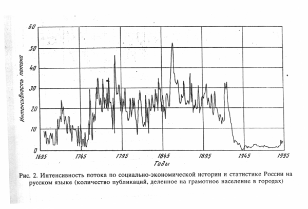 Уже сам характер потока информации на русском языке по рассматриваемой тематике говорит о многом. На нем явно видны переломные периоды роста потока, колебания, которые предстоит в дальнейшем сопоставить с изменчивостью других показателей. Четко просматривается исключительный провал содержательной информации по количественной истории страны в сталинское время.