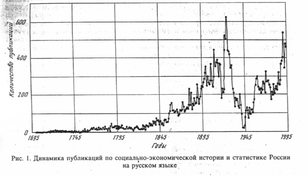 В первую очередь сам накопленный массив библиографических карточек явился исходной базой для анализа динамики той части элитной культуры, которая ассоциируется с самосознанием собственной экономической истории и статистики. Следует добавить, что ббльшая часть гуманитарного научного потока печатной информации, особенно в XVIII и XIX веках, касалась исторических разысканий и значительного массива официальных статистических публикаций. Во всей научной и художественной литературе XIX века усматривается повышенный, жгучий интерес к истории страны. Он продолжался до середины 20-х годов текущего столетия, затем резко спал и только в самое последнее время стал приближаться по числу публикаций к пику 1925 года. Отмеченные особенности потока публикаций по социально-экономической истории и статистике России отражены на графике (см. рис. 1). Следует заметить, что аналогичный график по иностранным публикациям, который здесь не приводится, не имеет провалов и носит характер монотонного нарастания величины потока.