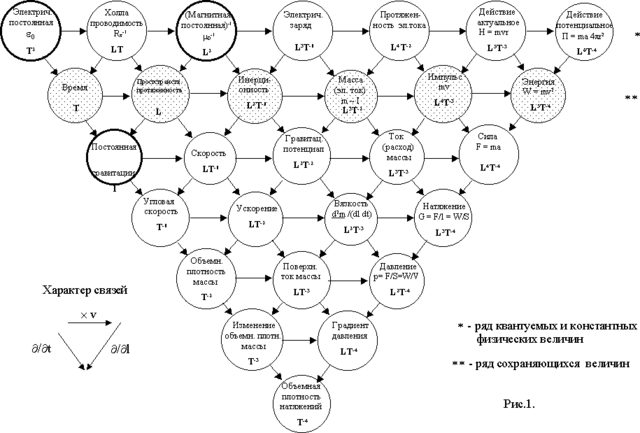 Взаимосвязи между элементами системы имеют однозначные и вполне определенные значения. При переходах слева направо или справа налево, размерность каждого элементов изменяется на размерность скорости (LT-1). При переходах от элемента к элементу сверху вниз, в зависимости от направления (вправо или влево), размерности элементов системы изменяются на размерность пространственной протяженности (L) или времени (T). Снизу вверх все элементы происходят (как бы произрастают) из единого для всех корневого элемента – объемной плотности пространственных натяжений, имеющей размерность – T-4.