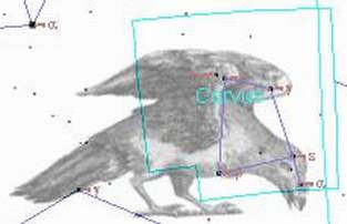 Из четырех звезд дельта, бета, эпсилон и гамма составляющих контур созвездия Ворона, первая из них (3m) - двойная. В большой школьный рефрактор на расстоянии 24" от нее можно увидеть спутник-красную звездочку 8m. Самая яркая звезда гамма - 2,6m. Это - горячий белый гигант, находящийся от нас на таком же расстоянии (около 40 пк), как весьма похожая на нее по физическим свойствам звезда дельта.