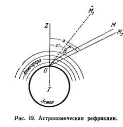 Видимое положение светила над горизонтом, строго говоря, отличается от вычисленного по формуле. Дело в том, что лучи света от небесного тела, прежде чем попасть в глаз наблюдателя, проходят сквозь атмосферу Земли и преломляются в ней, а так как плотность атмосферы увеличивается к поверхности Земли, то луч света (см. рис. ниже) все более и более отклоняется в одну и ту же сторону по кривой линии, так что направление ОМ1 , по которому наблюдатель О видит светило, оказывается отклоненным в сторону зенита и не совпадающим с направлением ОМ2 (параллельным ВМ), по которому он видел бы светило при отсутствии атмосферы.