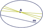 Докажем, что расстояние, пройденное человечком на любом шаге, меньше двух. Ясно, что длина шага= 1/(n2)<1/(n(n-1))= 1/n-1 – 1/n (*) Тогда расстояние R = 1/4 + 1/9 + ... + 1/n2 по неравенству (*) 1/4+ 1/9+...+1/n2 < 1-1/2 + 1/2-1/3 +.... 1/(n-1) -1/n Нетрудно видеть, что все слагаемые кроме 1 и 1/n сократятся. Тогда получим : 1+ 1/4 + 1/9+...+1/n2 < 2 – (1/n) Таким образом, никто из обитателей круга не сможет доказать, что их мир ограничен, и они верят, что справедлива аксиома Евклида: «Через точку вне прямой проходит единственная прямая, параллельная данной». Но в круге роль прямых для обитателей этого круга играют отрезки, соединяющие точки окружности. Но очевидно, что через любую точку вне отрезка можно провести сколько угодно отрезков, не пересекающих данный (см. рисунок).