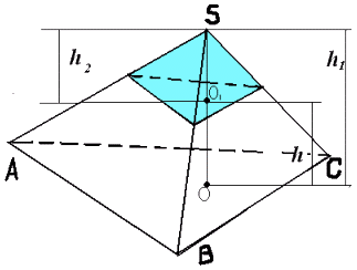 Объем пирамиды SABC равен: V=1/3Sh1, а пирамиды SA1B1C1 равен: V=1/3S1h2. Vу=Vп – Vм= 1/3(Sh1 – S1h2) (*)