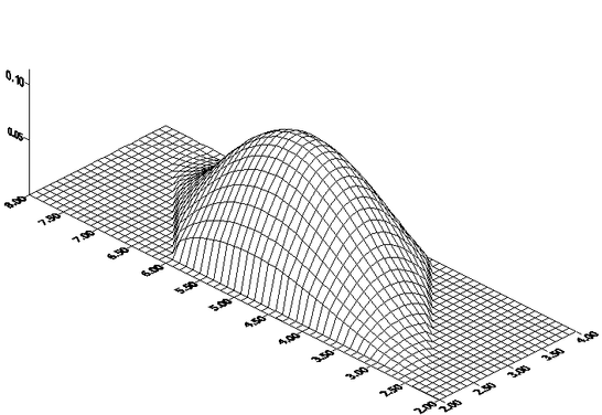 for(i=0;i if (arrayX[i]>arrayX[i+1]) {double tmp=arrayX[i]; arrayX[i]=arrayX[i+1]; arrayX[i+1]=tmp;}} LastUnreg=LastUnreg-1; } for (i=0;i<13;i++) { printf("%g ",arrayX[i]); } printf("\n"); } void RegArrayY() { int LastUnreg = 33 ; while (LastUnreg != 0) { for(i=0;i if (arrayY[i]>arrayY[i+1]) { tmp=arrayY[i]; arrayY[i]=arrayY[i+1]; arrayY[i+1]=tmp;}} LastUnreg=LastUnreg-1; } for (i=0;i<33;i++) { printf("%g ",arrayY[i]); } printf("\n");} // End of Regulation void CrMtrD(void) //Create general Matrix { for(i=0;i<13;i++) for(j=0;j<33;j++) {arrayP[i][j].BelongsToDh_=0; arrayP[i][j].BelongsToDh=0;} for(i=0;i<13;i++) for(j=0;j<33;j++) { arrayP[i][j].xx=arrayX[i]; arrayP[i][j].yy=arrayY[j]; } // printf("%g %g",arrayP[12][0].xx,arrayP[12][0].yy); // printf("\n"); } int IsFit(point Par) //does point belong to area D? { if ((Par.xx=1.99) && (Par.yy>=Par.xx) && (Par.yy<=Par.xx+4)) return 1; else return 0; } void CreateDh_(void) //Create area Dh_ { for(i=0;i<13;i++) for(j=0;j<33;j++) if (IsFit(arrayP[i][j])) arrayP[i][j].BelongsToDh_=1; cout << arrayP[1][1].BelongsToDh_<< "\n"; cout << arrayP[1][1].xx << " " << arrayP[1][1].yy<<"\n"; } void FillF(void) // calc function F(x,y) at area Dh_ { for(i=0;i<13;i++) for(j=0;j<33;j++) if (arrayP[i][j].BelongsToDh_==1) arrayP[i][j].F=arrayP[i][j].xx*pow(arrayP[i][j].yy,2); else arrayP[i][j].F=0; } int IsInner(int i,int j) //Is point inner? { if ((arrayP[i-1][j].BelongsToDh_==1) && (arrayP[i+1][j].BelongsToDh_==1) && (arrayP[i][j+1].BelongsToDh_==1) && (arrayP[i][j-1].BelongsToDh_==1)) return 1; else return 0; } void CreateDh(void) //Create area Dh { for(i=0;i<13;i++) for(j=0;j<33;j++) if ((arrayP[i][j].BelongsToDh_==1) && IsInner(i,j)) arrayP[i][j].BelongsToDh=1; } void FillF_() //calc new appr. values of F { for(i=0;i<13;i++) for(j=0;j<33;j++) { if (arrayP[i][j].BelongsToDh==1) arrayP[i][j].F_=(arrayP[i-1][j].F+arrayP[i+1][j].F+ arrayP[i][j-1].F+arrayP[i][j+1].F)/4; else arrayP[i][j].F_=0; } } void CountDif() // find maximal difference abs(F-F_) { k=0; for(i=0;i<13;i++) for(j=0;j<33;j++) { if (arrayP[i][j].BelongsToDh==1) { diff[k]=fabs(arrayP[i][j].F_-arrayP[i][j].F); k++;}} E1=diff[0]; for (k=1;k<500;k++) { if (diff[k]>E1) E1=diff[k];} } void MakeFile() { ofstream f; FILE *f1=fopen("surf.dat","w1"); fclose(f1); f.open("surf.dat",ios::out,0); for(i=0;i<13;i++) for(j=0;j<33;j++) { if (arrayP[i][j].BelongsToDh==1) { f< " "< f.close() ; } 4.ГРАФИКИ РЕШЕНИЙ РИС.1 шаг h=0.2 РИС.2 шаг h=0.1 5.ВЫВОД Функция f(x,y) является неотрицательной в области D. Полученное решение лежит целиком над плоскостью XOY . Для данного решения выполняется принцип максимума.