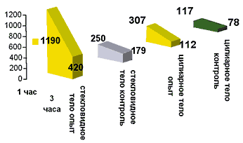 На правых глазах животных данной группы производилось нанесение коагулятов по описанной выше методике, левые глаза служили контролем. Забой пяти животных осуществлялся через 1 час после введения препарата, оставшихся пяти – через 3 часа. При исследовании радиоактивности образцов стекловидного и цилиарного тела было отмечено быстрое проникновение препарата внутрь глаза уже через час после инъекции, причем в опыте в стекловидном теле обнаружено 0,2% от введенного количества радиоактивной метки (в среднем 1190 сцинтилляций в минуту), что превышает значения радиоактивности в конрольной группе в 4,76 раза (250 сцинтилляций в минуту). Через 3 часа эти показатели уменьшились и составили в среднем 420 и 179 сцинтилляций в минуту соответственно (0,07% и 0,03% от введенного субконъюнктивально количества I131). Кроме того, было отмечено некоторое накопление радиоактивной метки в цилиарном теле: через 1 час в опытной группе оно составило 307 сцинтилляций, в контроле – 117, а через 3 часа – 112 и 78 соответственно (рис. 4).