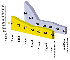 Рис. 2. Интенсивность сцинтилляций в минуту образцов биологических тканей в течение первых 4, 8,12 и 16 часов после введения раствора с радиоактивной меткой у кроликов после ЛЦК (фоновое значение 40-50 сцинтилляций в минуту).