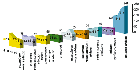 Рис. 1. Интенсивность сцинтилляций в минуту образцов биологических тканей после введения раствора с радиоактивной меткой (фоновое значение 40-50 сцинтилляций в минуту).