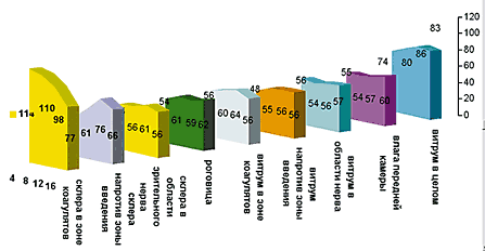 Через 12 часов отмечается значительное повышение количества сцинтилляций образцов стекловидного тела в зоне зрительного нерва, которое достигает своего максимума к 16 часам. Одновременно фиксируется адекватное увеличение радиоактивности навески, в состав которой входит склера, хориоидея и сетчатка в этой же области. Исследование излучения оставшейся витреальной массы показало значительный рост концентрации I131, вызывающий через 4 часа 2–хкратное, а через 16 часов – 4–хкратное превышение фоновых значений радиоактивности.
