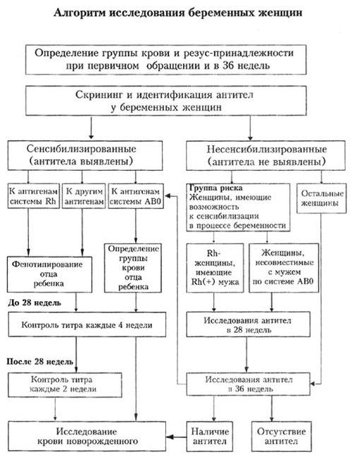 Несенсибилизированным женщинам группы повышенного риска аллоиммунизации необходимо повторить скрининг антител в 28 и 36 недель беременности и в течение месяца после родов. При появлении аллоантител дальнейшие исследования женщине проводятся так же, как и сенсибилизированным беременным.