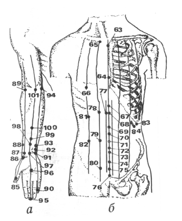 Вначале производят воздействие на главные точки: 30, 86, а затем на дополнительные: 46, 85,106.