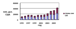Что касается торговли со странами СНГ и остальным миром, то здесь мы видим, что страны СНГ занимают лидирующее положение и практически в течение всего рассматриваемого периода их доля составляла до 67%. Но за последние два года ситуация изменилась, удельный вес этих стран практически сравнялся с удельным весом остальных стран и уже в 2006 г. составлял 55%.