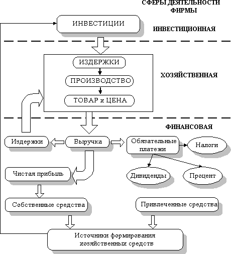 Схема показывает, как новые инвестиции, добавляясь к общей сумме ранее инвестированных средств, поступают в хозяйственную сферу деятельности. В процессе хозяйственной деятельности в результате комбинации факторов производства и взаимодействия между такими категориями, как цены, объемы производства и реализации продукции и различные виды издержек, формируется валовая прибыль как разница между ценой продукции и ее себестоимостью (издержками на производство и реализацию). В финансовой сфере деятельности производится распределение этой прибыли между владельцами (в форме дивидендов), кредиторами (в процентах) и бюджетом (в виде налогов). Часть нераспределенной прибыли реинвестируется для развития производства и вместе с привлеченным капиталом составляет потенциал финансирования предприятия, который в виде новых инвестиций вновь поступает в хозяйственную деятельность.