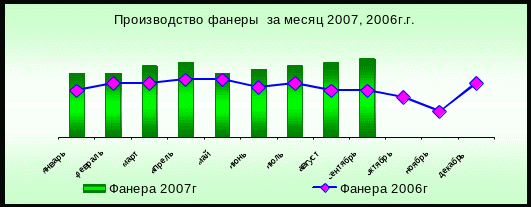 Темпы роста по обработке древесины и производству изделий из дерева за 9 месяцев 2007 года составили 114,5% по отношению к соответствующему периоду 2006г. Увеличился объем выпуска продукции с высокой степенью переработки - древесностружечных плит, фанеры клееной.