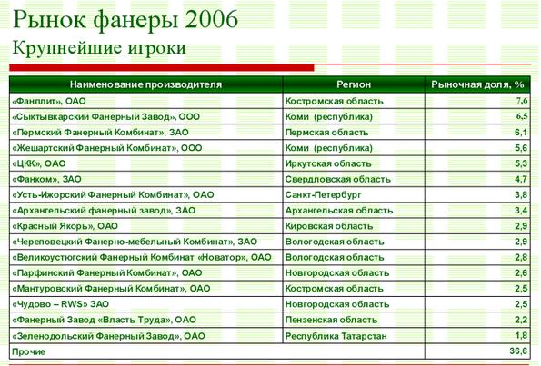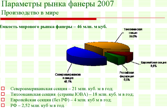 По оценке Фонда перспективных исследований и инициатив, в 2005 году наблюдалось дальнейшее повышение доли РФ на мировом рынке клееной фанеры. Эта доля составила в 2005 году 3,15% (против 2,96% в 2004 г.) Достаточно высокая конкурентоспособность продукции из РФ, главным образом за счет ценового фактора (практически вся продукция деревообработки из РФ предлагается на мировом рынке по ценам ниже, чем среднемировые цены).