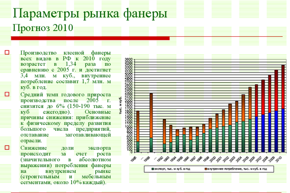 Одновременно с увеличением российской доли мирового рынка произойдет рост внутреннего потребления и экспорта. В течение ближайших пяти лет доля России в мировом экспорте фанеры будет увеличиваться в большей степени за счет ухода с мирового рынка ряда производителей из Европейских стран и стран Азии, хотя в целом концентрация азиатских производителей будет увеличиваться за счет переноса части производств из развитых стран.
