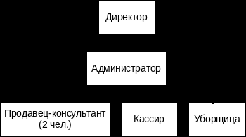 В магазине потребуются два продавца-консультанта, кассир и уборщица. Все они подчиняются администратору торгового зала, который в свою очередь подчиняется директору (см. рис. 2).