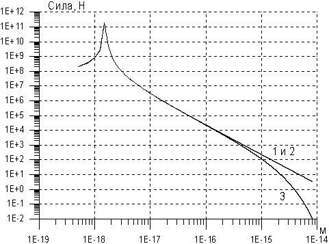 Рис. 1. 1 и 2 – силы Ньютона-Кулона, 3 – силы, подправленные на потенциал Юкавы. В зависимости от ядерных расстояний