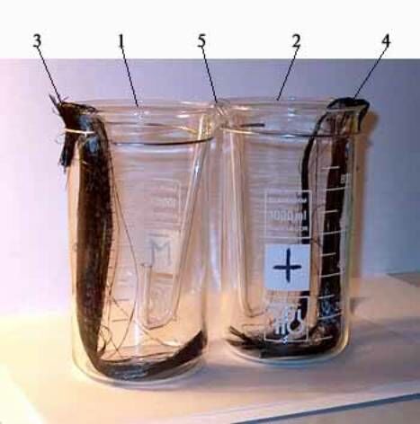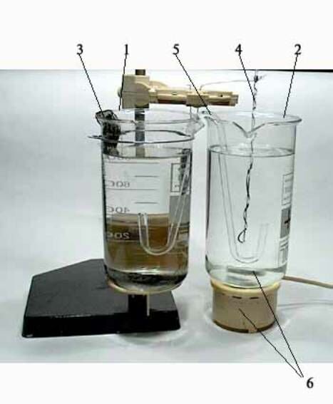 1, 2 – стаканы, стекло; 3, 4 – электроды, графитовое волокно; 5 – гидрозатвор, стекло