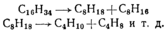 Термический крекинг проводится при нагревании исходного сырья (мазута и др.) при температуре 450...550 °С и давлении 2...7 МПа. При этом молекулы углеводородов с большим числом атомов углерода расщепляются на молекулы с меньшим числом атомов как предельных, так и непредельных углеводородов. Например: