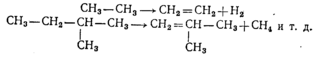 При температурах 700...1000 °С проводят пиролиз (термическое разложение) нефтепродуктов, в результате которого получают главным образом легкие алкены — этилен, пропилен и др. и ароматические углеводороды. При пиролизе возможно протекание следующих реакций: