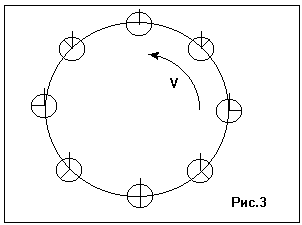 На рисунке 3 показано такое кольцо. Элементы и процессы в нем представлены в виде часов, показывающих текущую фазу процесса. Квантуются все связанные волновыми полями движения, и мы не привыкли к этому лишь потому, что сильных волновых полей и очень больших скоростей нет в нашей практике. А здесь показан лишь наиболее простой и наглядный пример квантования.