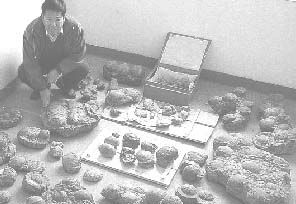 Только за один 1996 г. китайской полиции удалось конфисковать у контрабандистов 175 яиц разных видов динозавров, приготовленных для вывоза из страны и последующей продажи на черном рынке. А всего начиная с 1993 г. было конфисковано около трех тысяч яиц этих удивительных вымерших животных. Сейчас они хранятся в Институте культурных реликвий (Institute of Cultural Relics) под присмотром палеонтолога Донг Жиминга. Однако до 1993 г. жесткого контроля за вывозом яиц динозавров не существовало, что позволило предприимчивым американцам Флоренс и Чарльзу Маговернам во время путешествия в Китай вполне легально приобрести и вывезти к себе в Колорадо весьма большое количество этих палеонтологических находок. Там они продали значительную часть этих яиц по цене от 150 долларов до 1400 долларов за штуку . рыночная стоимость яйца определяется его сохранностью и наличием в нем эмбриона. Однако наиболее хорошие экземпляры супруги Маговерн решили сохранить для музеев. Самыми крупными из найденных к настоящему времени яиц динозавров являются яйца Macroelongatoolithus xixiaensis. Свое название они получили за вытянутую форму и место (долина Xixia), где были найдены. К сожалению, в большинстве яиц эмбрионы не сохранились и определить, какому виду динозавров они принадлежали, практически невозможно. В тех редких случаях, когда в окаменевших яйцах динозавров эмбрионы все-таки сохраняются, они, как правило, представляют собой беспорядочную груду косточек, лежащих на дне яйца. И только очень редко эмбрион, по каким-то особым причинам, сохраняется в относительной целостности. Такой хорошо сохранившийся эмбрион позволяет идентифицировать вид динозавра, который отложил яйцо. В данном случае это теризинозавр. На фотографии, сделанной с модели реконструированного эмбриона, хорошо видно, что маленький ящер лежал в яйце завитком, а мощный пупочный канатик соединял его тело с желточным мешком, из которого зародыш получал питание.