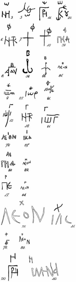 Вторым моментом является выдержанность их структуры. Основная часть находок представляет монограмму или буквенное сокращение имени с проставленным над ним буквенным знаком. Только в двух случаях такие буквы можно пытаться интерпретировать как выносные в сокращениях имен - дипинто 1 и 28. Для остальных очевиден иной смысл. Характерным здесь является повторение одних и тех же букв с разными именными основами (рис. 4). На что должен указывать верхний буквенный элемент дипинто неясно. Следует считать их числительными, или другого рода учетными индексами, заключать по имеющемуся материалу сложно. Доступные исследованию корреляции позволяют уточнить сомнительные варианты прочтения именных основ, однако устойчивых взаимозависимостей они не обнаруживают. Серьезным коррелятом в группе, как кажется, выступает только цвет, что хорошо видно на рисунках Р. Деманжеля и Е. Мэмбори. Однако и здесь не обнаруживается совпадений, способных привести к однозначным выводам. Вероятное объяснение этим корреляциям - узкохронологическое, скорее всего такие дипинто имеют непосредственную дату, что понятно ввиду характера формирования манганских комплексов.