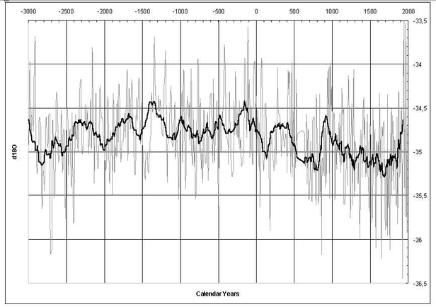 Из анализа этой изотопной кривой мы можем сделать определенные выводы о климатической ситуации в различные периоды "исторического" времени. Так, 5 тыс. лет назад температуры были на уровне современных, а затем наступило некоторое похолодание, осложненное рядом положительных осцилляций. Начиная с 2500 лет до н.э. и вплоть до пятого века новой эры эпоха была крайне теплой, с рядом незначительных похолоданий в районе 2000 г. до н.э., 1500 г. до н.э. и так далее, причем, в это время температура практически не опускалась ниже современной, а в целом было даже теплее, нежели сейчас. Наиболее холодным и резким явился, по всей видимости, локальный минимум II в. н.э., вслед за которым, после примерно трехсотлетнего теплого участка, началось существенное падение температуры, достигшее экстремальных значений в Малый Ледниковый Период, в XVI-XVII вв. Однако, на кривой в эту холодную эпоху отмечается положительная аномалия IX-XII вв., когда температуры снова оказались на уровне современных. В последнем, XX столетии, наблюдается стабильное потепление.Сходные выводы можно сделать, рассмотрев изотопную кривую по скважине GRIP [31, 32, 34, 35, 36]. Из графиков совершенно однозначно следует, что эпоха XXV в. до н.э. - IV-V вв. н.э. была весьма теплой, но затем ее сменило глобальное похолодание, продолжавшееся вплоть до начала прошлого века. Таким образом, картина температурных флуктуаций достаточно ясна. Изменения же влажности, как подчеркивалось выше, носят метахронный характер в разных областях, и поэтому их мы будем рассматривать ниже исключительно в локальном контексте.