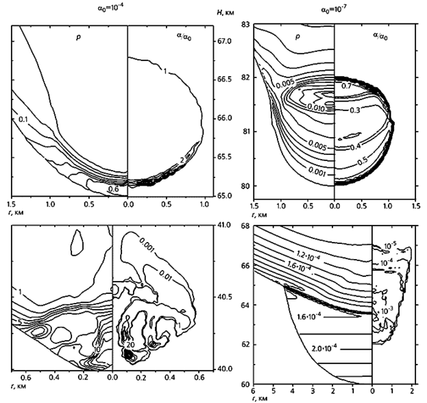 Пространственная эволюция течения по мере опускания сферического облака в атмосфере. Изолинии давления воздуха p (атм, левые части рисунков) и объемной доли частиц a/a0 (правые части рисунков) показаны в полуплоскости высота—радиальная координата ввиду предполагаемой осевой симметрии течения. Даны картины динамики для плотного (с начальной концентрацией частиц a0=10–4) и разреженного (a0=10–7) облаков.