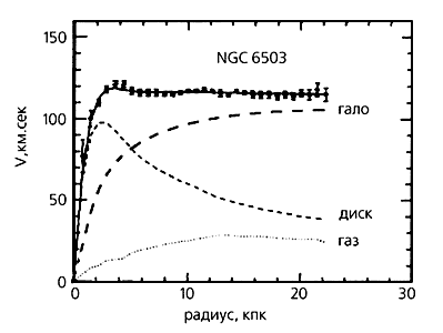 приведена ротационная кривая для спиральной галактики NGC 6503, построенная по наблюдениям в радиодиапазоне газообразного водорода. Видно, что на расстоянии от центра галактики более 5 кпк скорость остается практически постоянной. Такой вид зависимости предполагает, что не все объекты, составляющие общую массу галактики, движутся вместе с ней как “единое” целое. Поскольку вся барионная составляющая должна участвовать в таком движении, следовательно, часть скрытой массы оказывается небарионной. Для объяснения этого экспериментального факта и вводится понятие Темного галактического гало, состоящего из невидимых объектов (частиц), “компенсирующих” дефицит массы видимых объектов, расположенных в диске галактики.