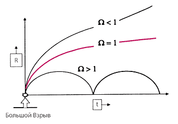 где R — радиус Вселенной на момент времени t, и может зависеть от времени. Современное значение постоянной Хаббла обозначают H0. Поскольку она экспериментально еще не определена с достаточной точностью, ее обычно записывают как H0 º 100h·км·с–1×Мпк–1, где h ~ 0.65. А как она меняется во времени, т.е. как протекает процесс расширения, зависит от общей массы Вселенной [2].