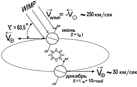 Этот эффект — следствие сложения скоростей налетающих на Землю частиц со скоростью Земли: комбинация движения Солнца (вокруг центра Галактики) через галактическое Темное гало и вращения Земли вокруг Солнца будет разной для различных времен года. Максимум скорости счета ожидается 2 июня, когда Земля движется против потока частиц, а минимум — ровно через полгода, когда Земля «убегает» от них, рис. 5.